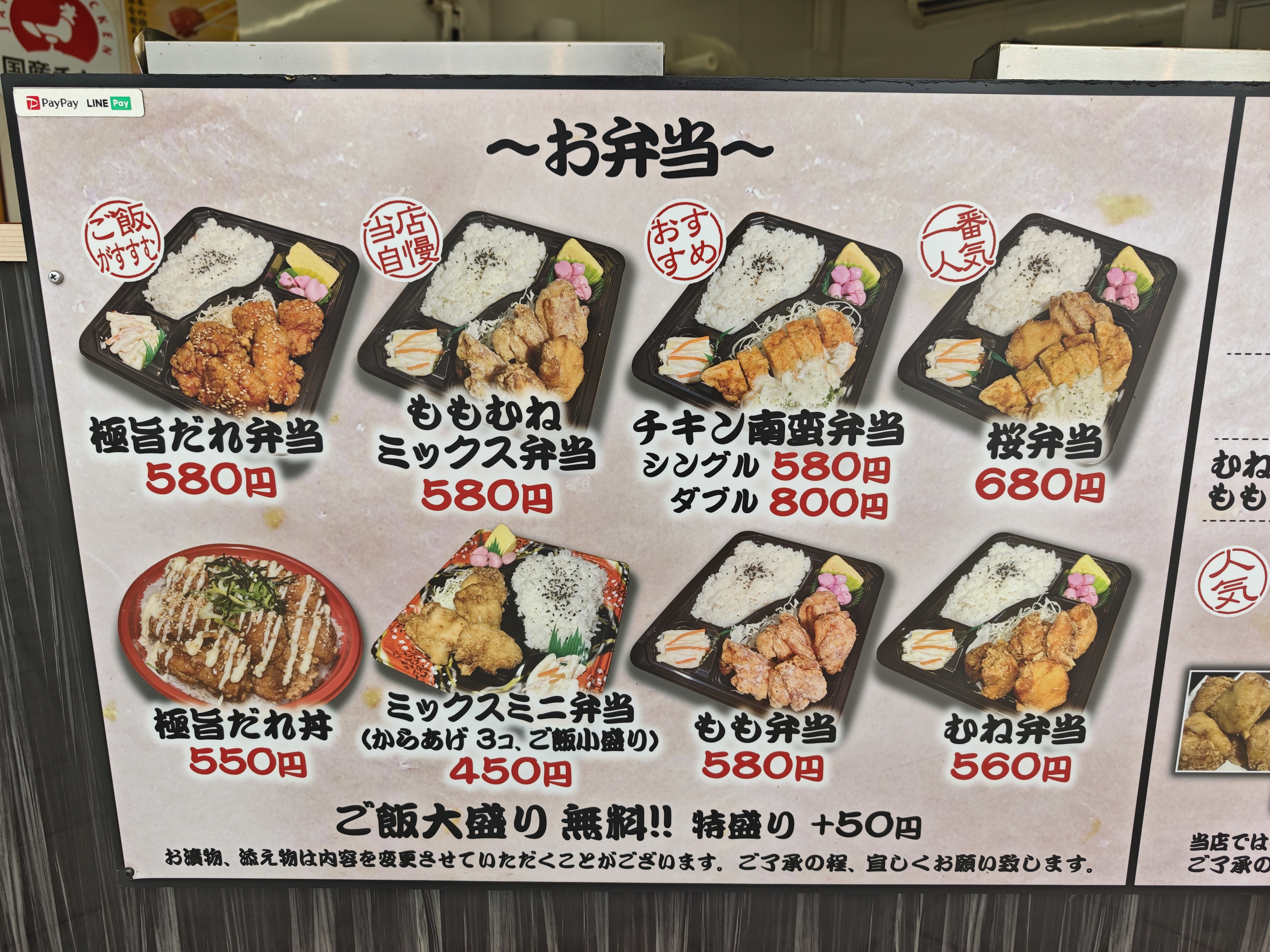もも、むねの唐揚弁当やチキン南蛮弁当など、国産若鶏を使ったお弁当が用意されています。