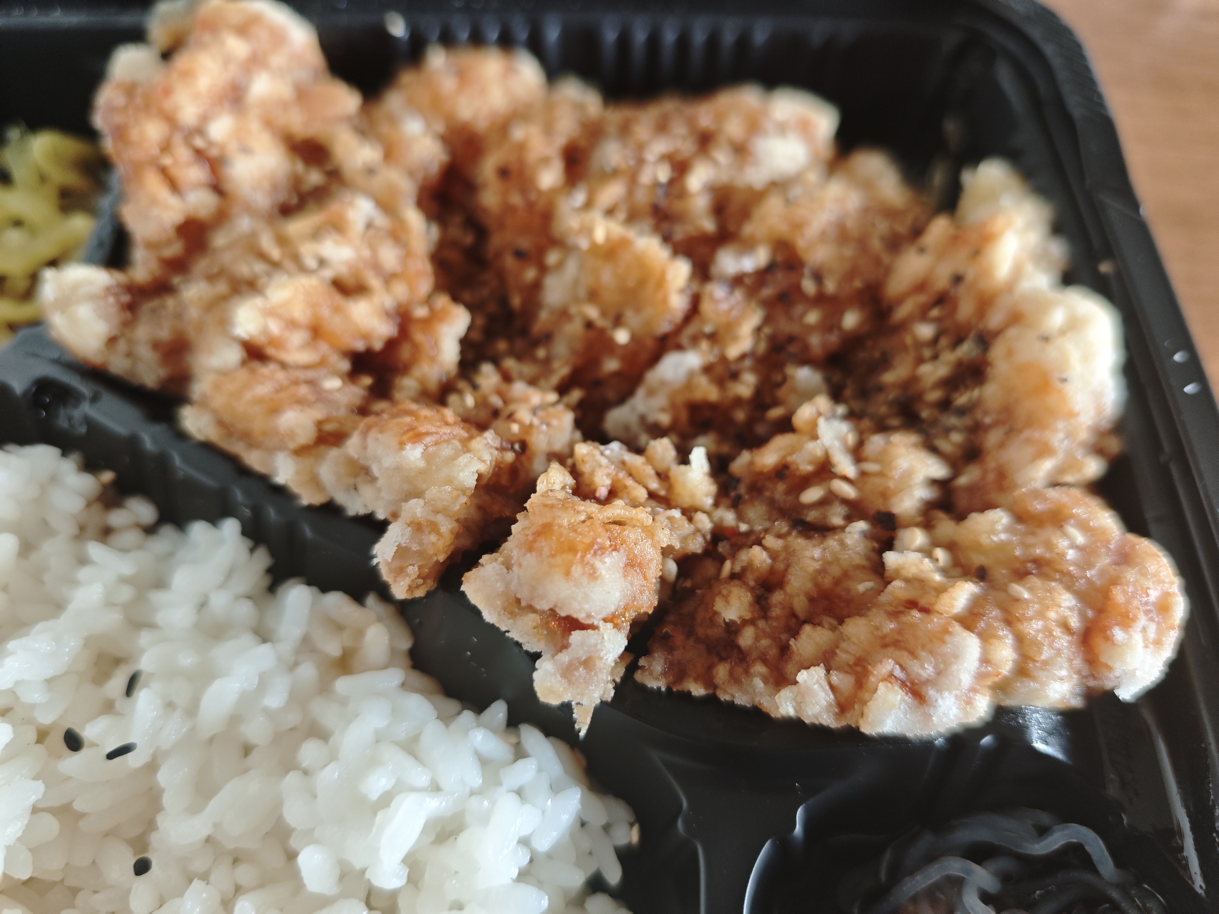 甘辛い秘伝ダレがもも肉の唐揚にマッチしてとても美味しくボリュームも満足、定期的に食べたくなるお弁当です。