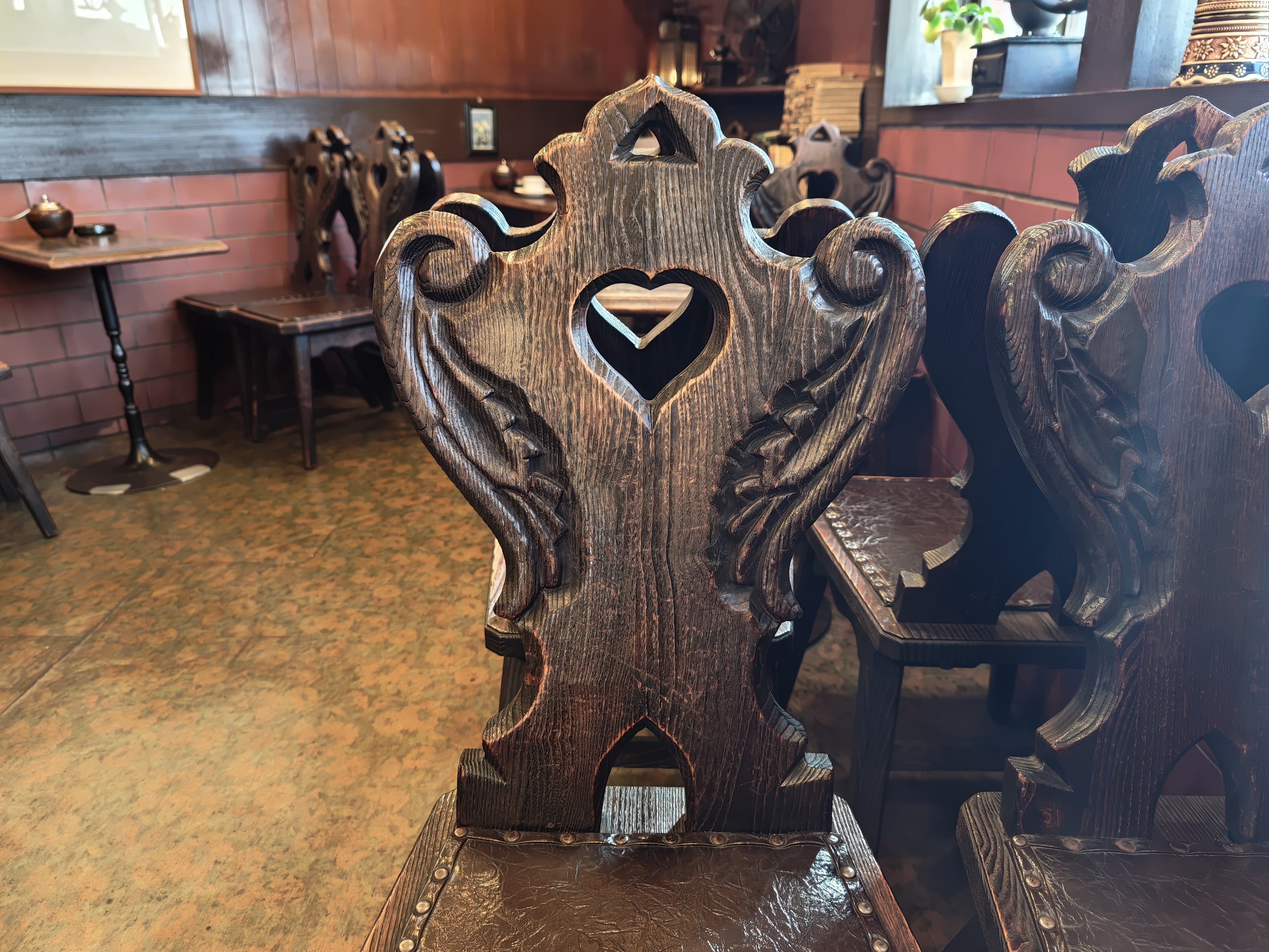 革張りのソファーや木のテーブル、チェアなどのアンティーク家具が並んでいるのも雰囲気抜群です。