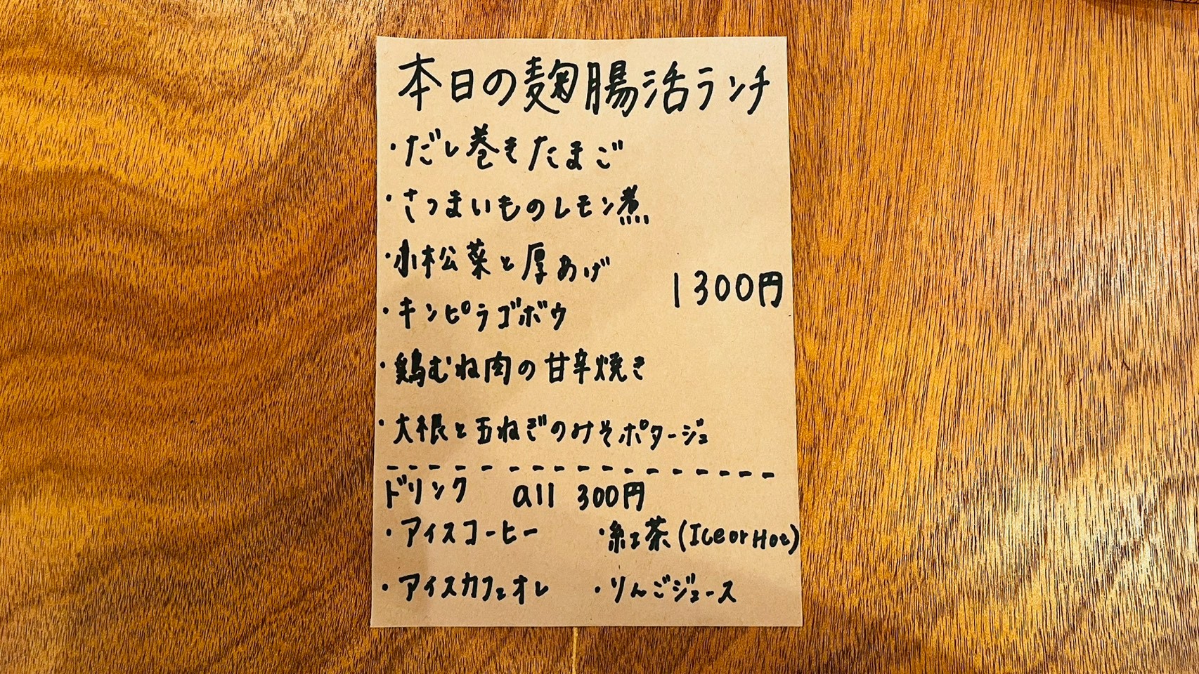 この日は@koji_kopi_さんの「本日の麹腸活ランチ」1300円。手書きのメニューがどこか温かみを感じます。