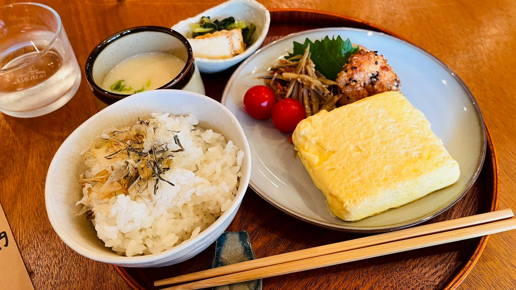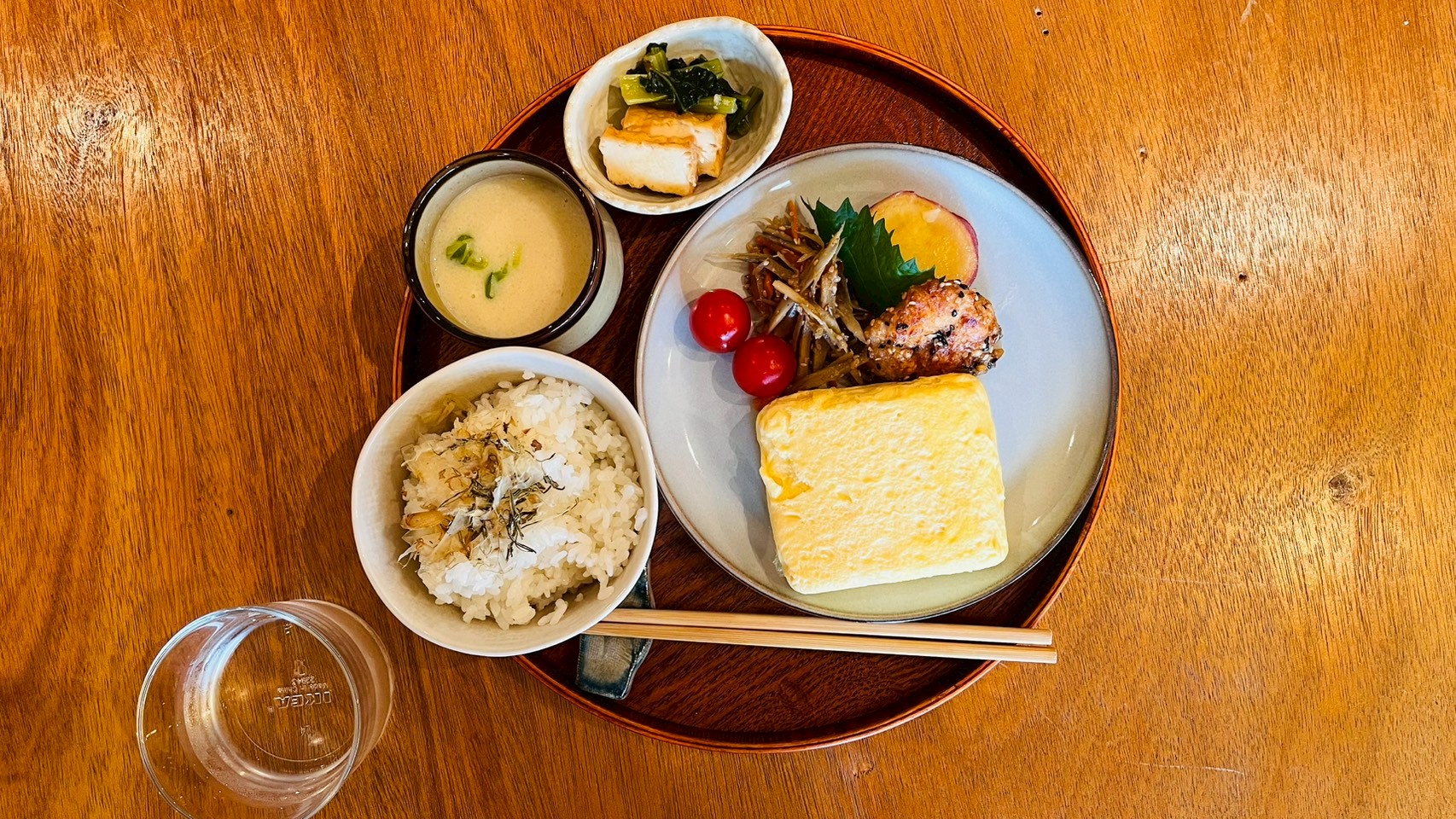 ふわふわのだし巻き玉子、さつまいものレモン煮、小松菜と厚揚げ、きんぴらごぼう、鶏むね肉の甘辛焼き、大根と玉ねぎのポタージュ。懐かしさを感じるランチプレートです。特にポタージュに入っている玉ねぎ麹が何とも言えない美味しさ。お代わりしたくなります。滋味に富む、体に優しい味わいです。