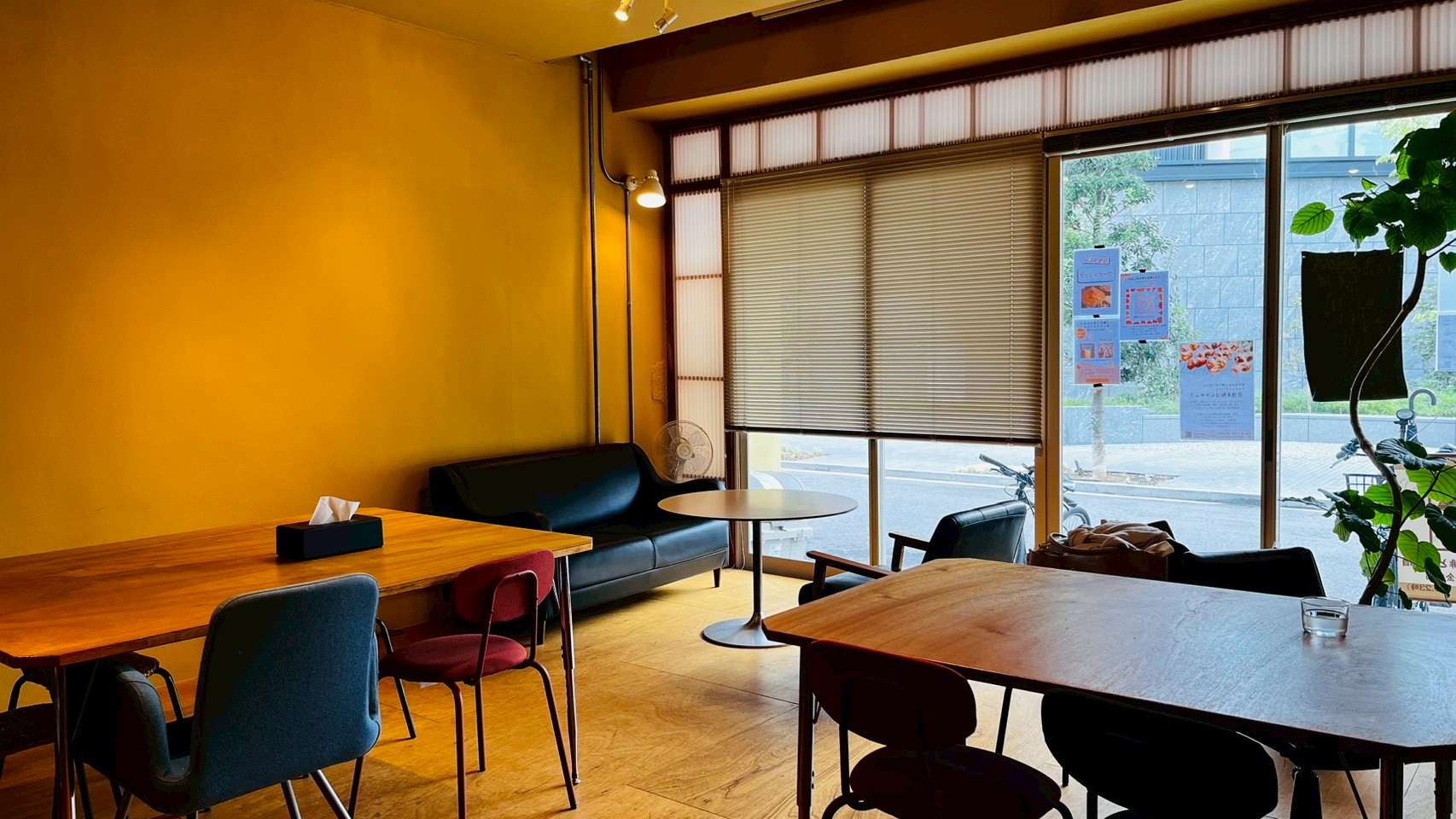 店内に入ると、温かみのあるマスタードイエローの壁が迎えてくれます。木製のテーブルとブルー、ブラックの椅子が組み合わされた空間は、モダンでありながらどこか懐かしい雰囲気。