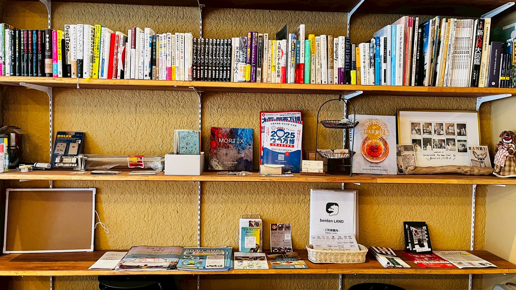 壁際には本棚があり、経済学やビジネス、思想書などが並んでいます。地域の情報誌やカフェや地域イベントのパンフレットも置かれており、ちょっとした待ち時間にも飽きることがありません。