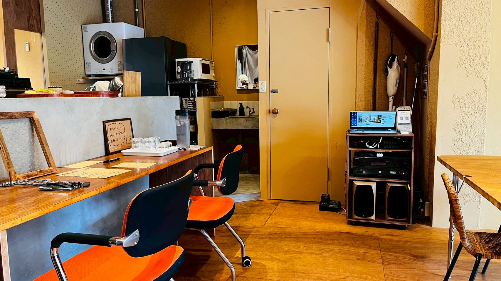 奥のカウンター席には電源が完備されており、ちょっとしたパソコン作業ができます。カウンターの奥が間借りキッチンとなっています。