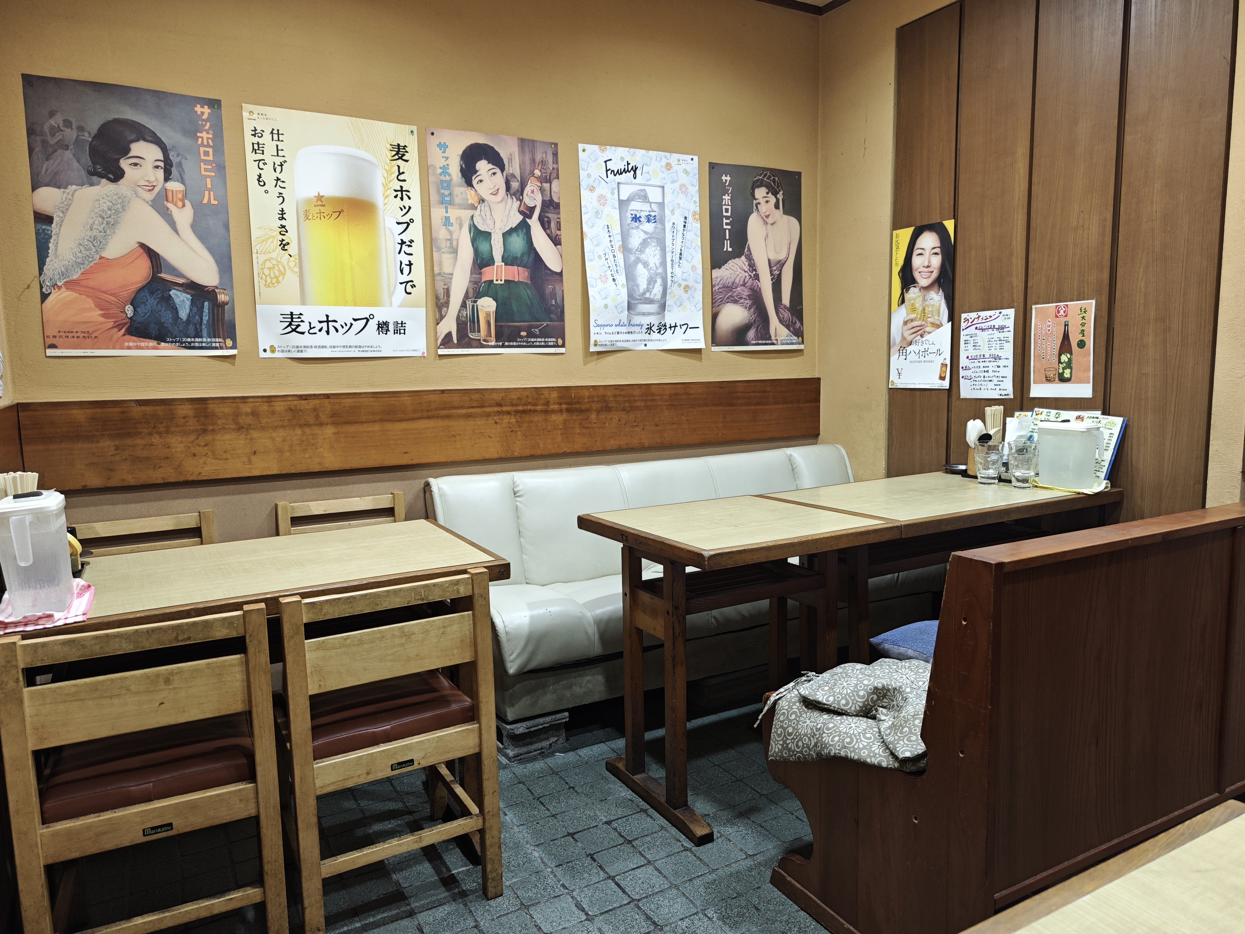 店舗奥には4名がけのテーブル席やソファ席があり、壁にはレトロなポスターが貼られています。