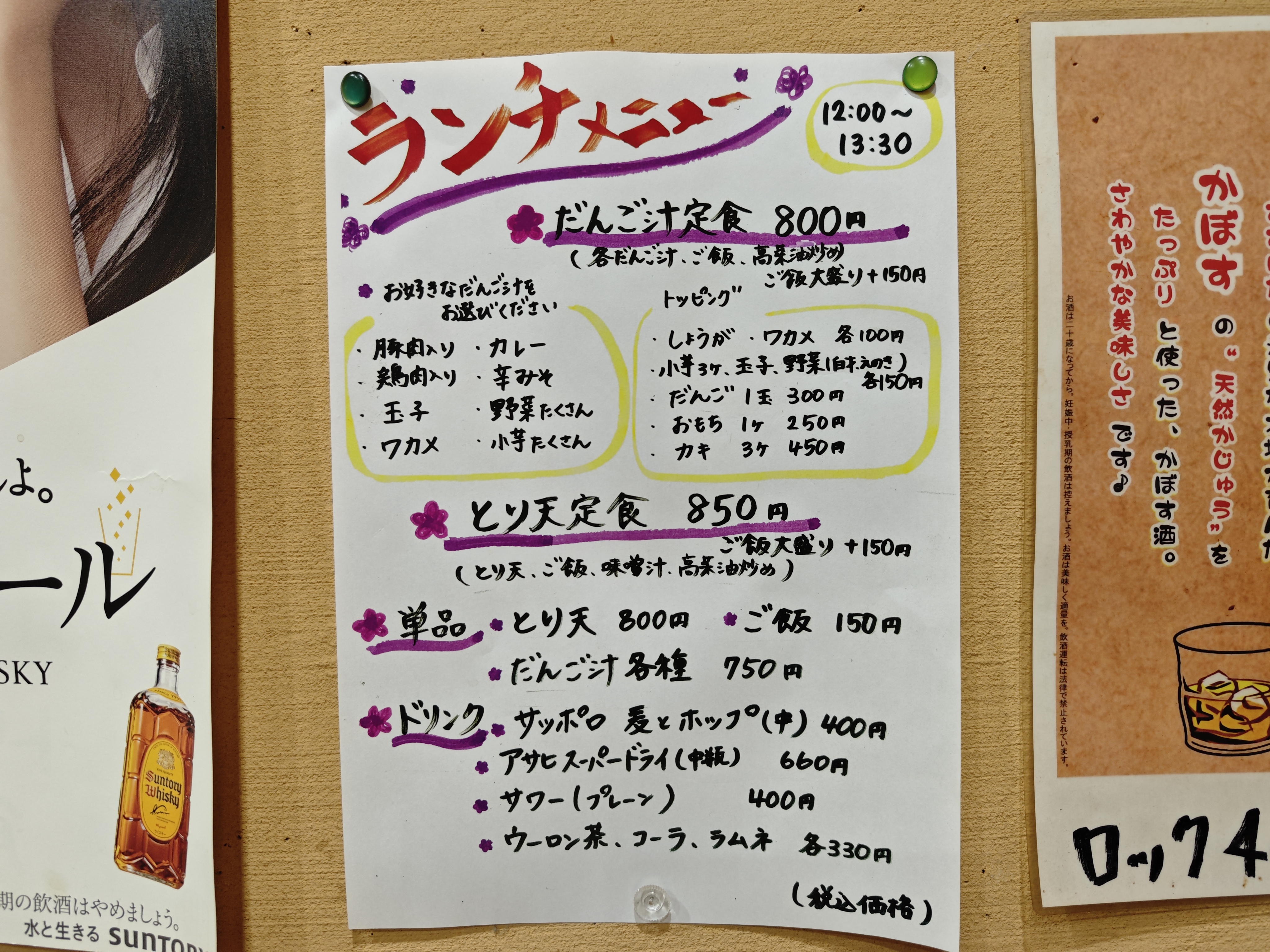 ランチタイムにお邪魔しました。ランチ営業は12時〜13時半で、メニューは「だんご汁定食」と「とり天定食」の2メニュー。