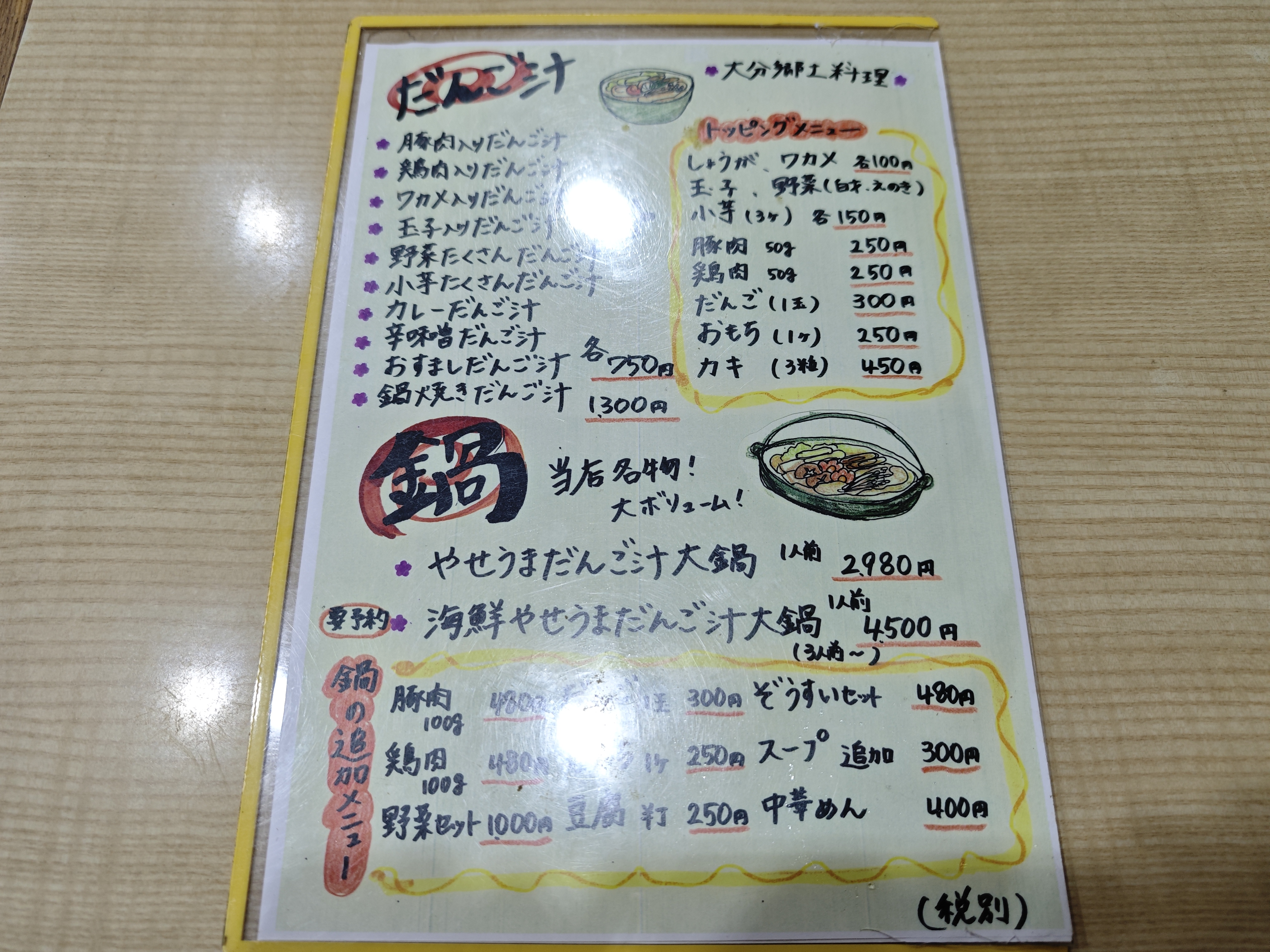 「九州八豊やせうまだんご汁 てっちゃん店」メニュー