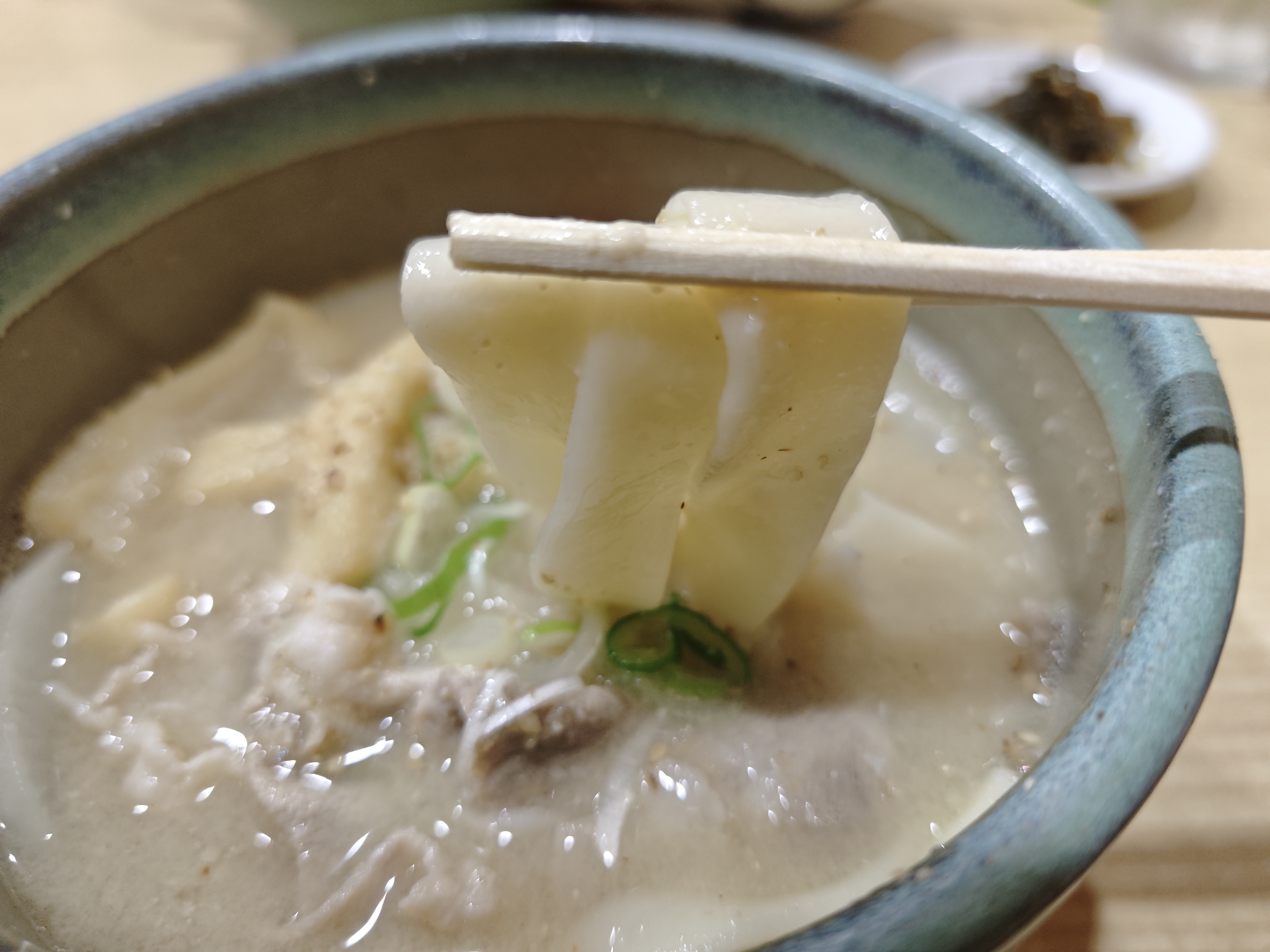 だんご汁の麺は食べ応えのある柔らかいきしめんのような平麺でした。だんごでは無いんですね。