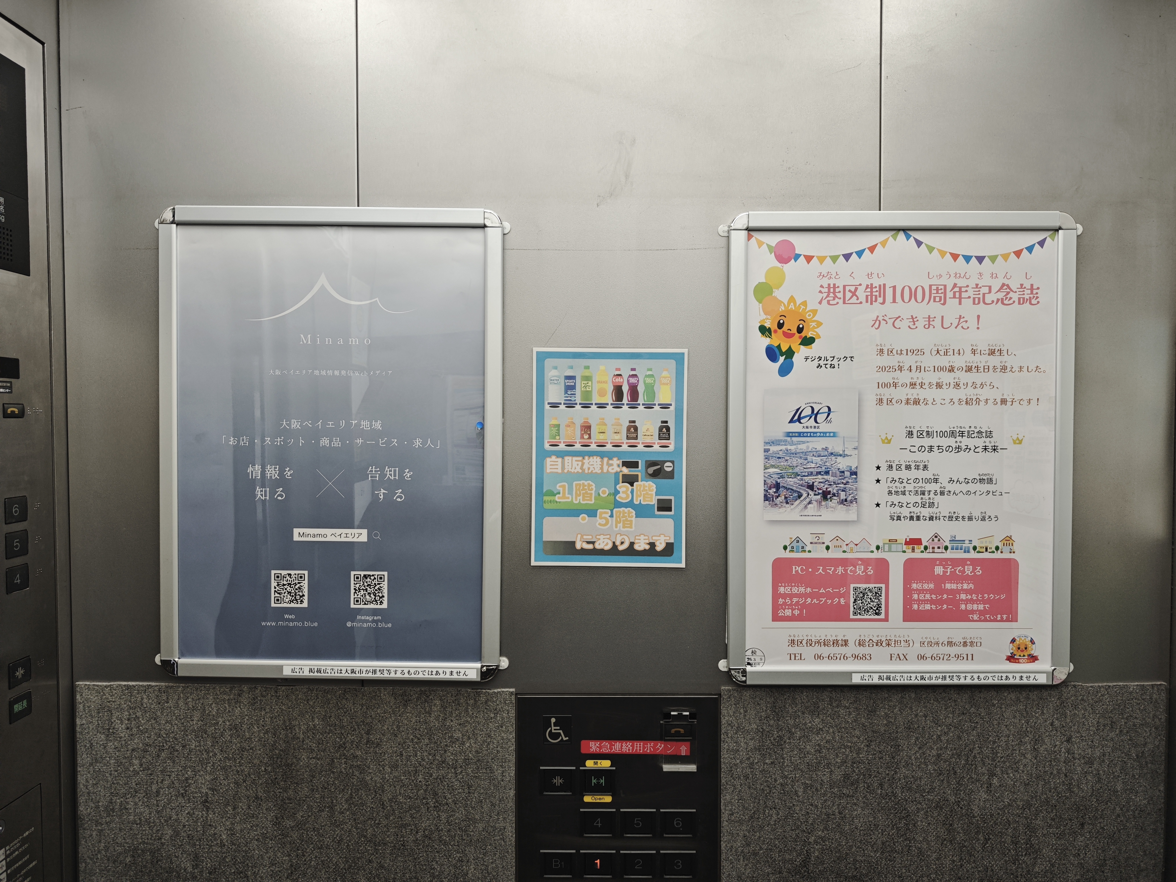 港区役所内の正面玄関側エレベーター内にMinamoの告知ポスターを掲載していただいております。
